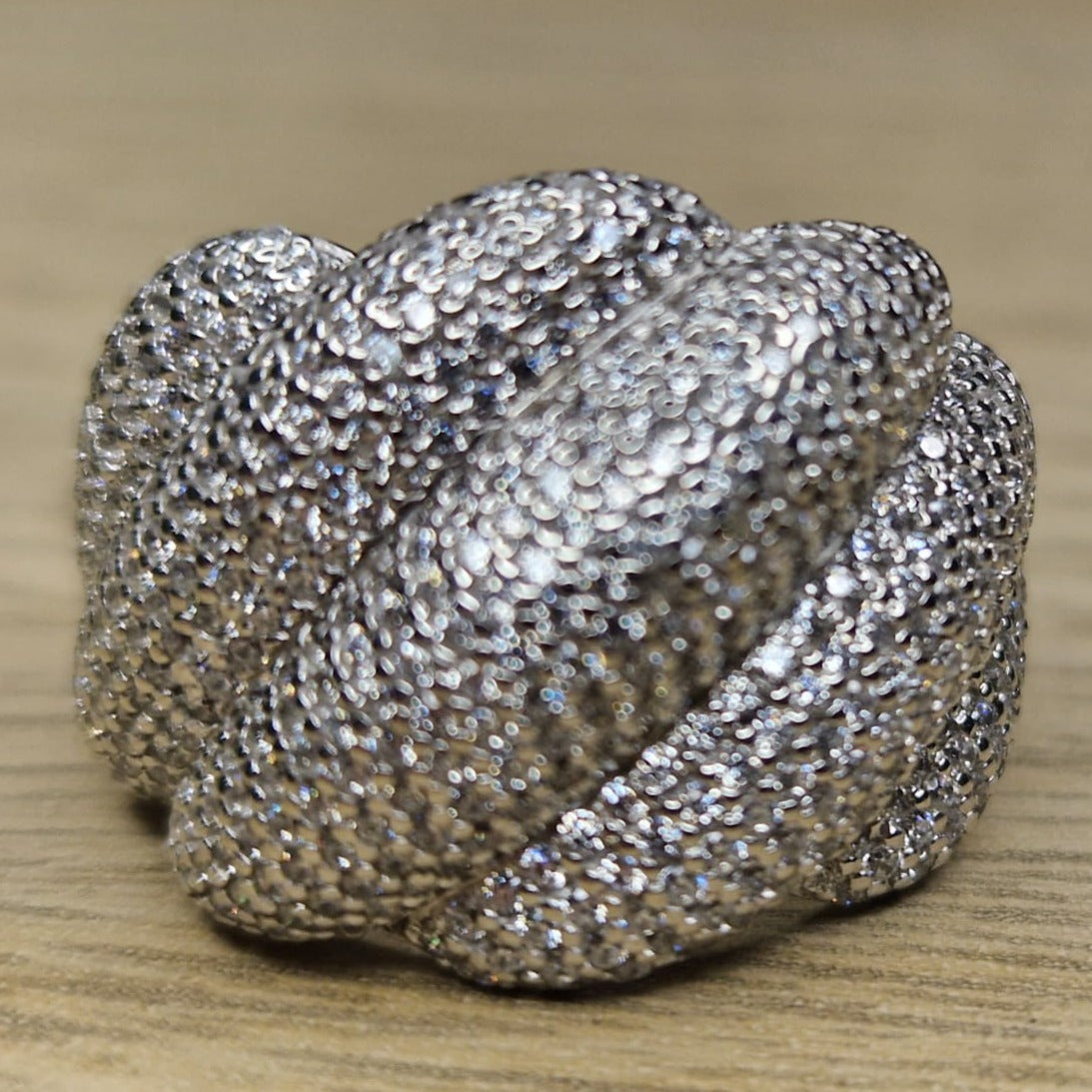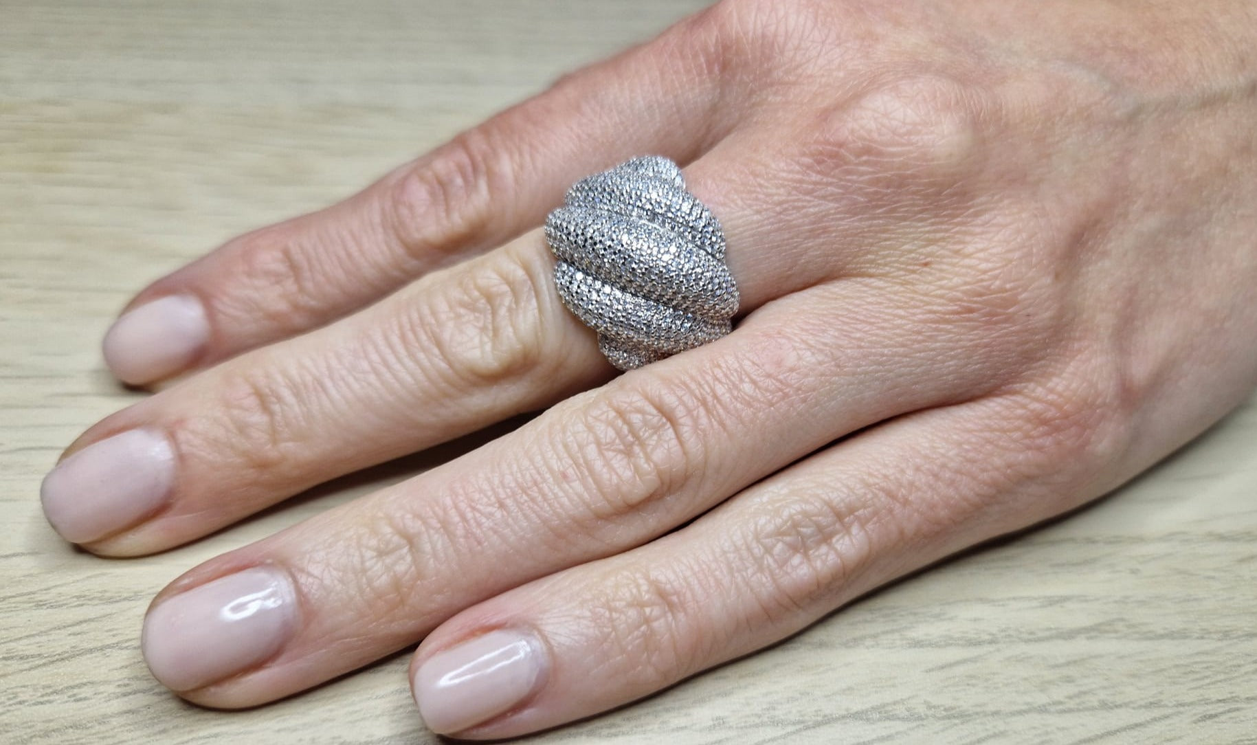SOFIA presents majestic waves, which evokes the sea with its mastery in movement. Each section of waves has been meticulously crafted to provide an impressive appearance, the surface of the ring is adorned with 0.3mm micro zircons, carefully distributed throughout its entire length, of a radiant shine and exceptional quality, evoke the dazzling reflection of the sky star-filled night, the visual effect is shocking.